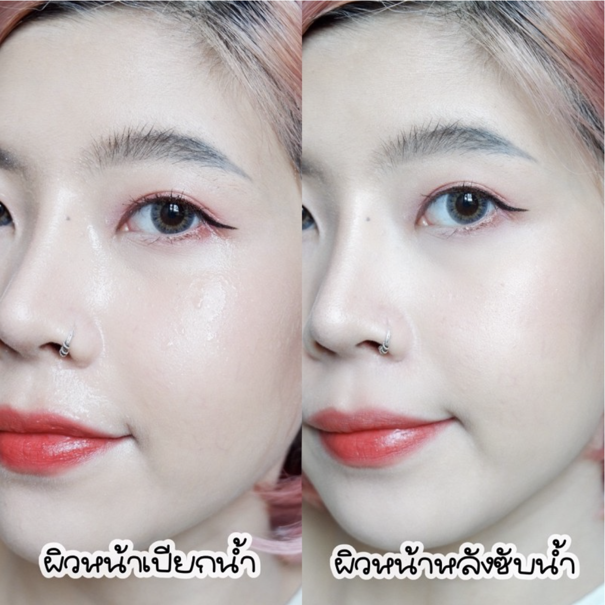 ไหนมาลองทดสอบเรื่องกันน้ำบ้าง ตอนปปลองคือหน้าเปียกยิ่งกว่าเหงื่ออกปกติอีกนะ55555 แล้วดูดิ พอซับหน้าปุ๊ป ไม่มีความเยิ้มใดๆ และผิวดูชุ่มชื่นขึ้นไปอี้กกกก คือโครตตอบโจทย์สาวๆอย่างเราเลย